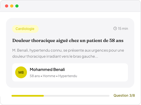 Développez votre raisonnement clinique étape par étape, avec un feedback expert à chaque décision.